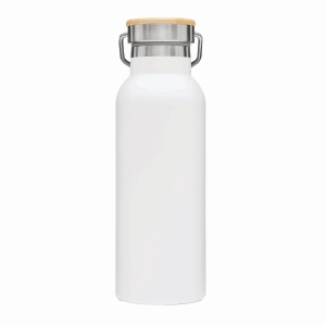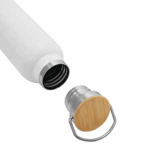 Artikel-Nr: INP56-0304661Vakuum-Trinkflasche ECO FLAVOUR: doppelwandig, außen und innen aus Edelstahl, Bambus-Deckel mit sicherem Schraubverschluss, Silikon-Dichtring und Tragegriff, Füllmenge ca. 500 ml, hält ca. 8 Stunden warm und bis zu 12 Stunden kalt