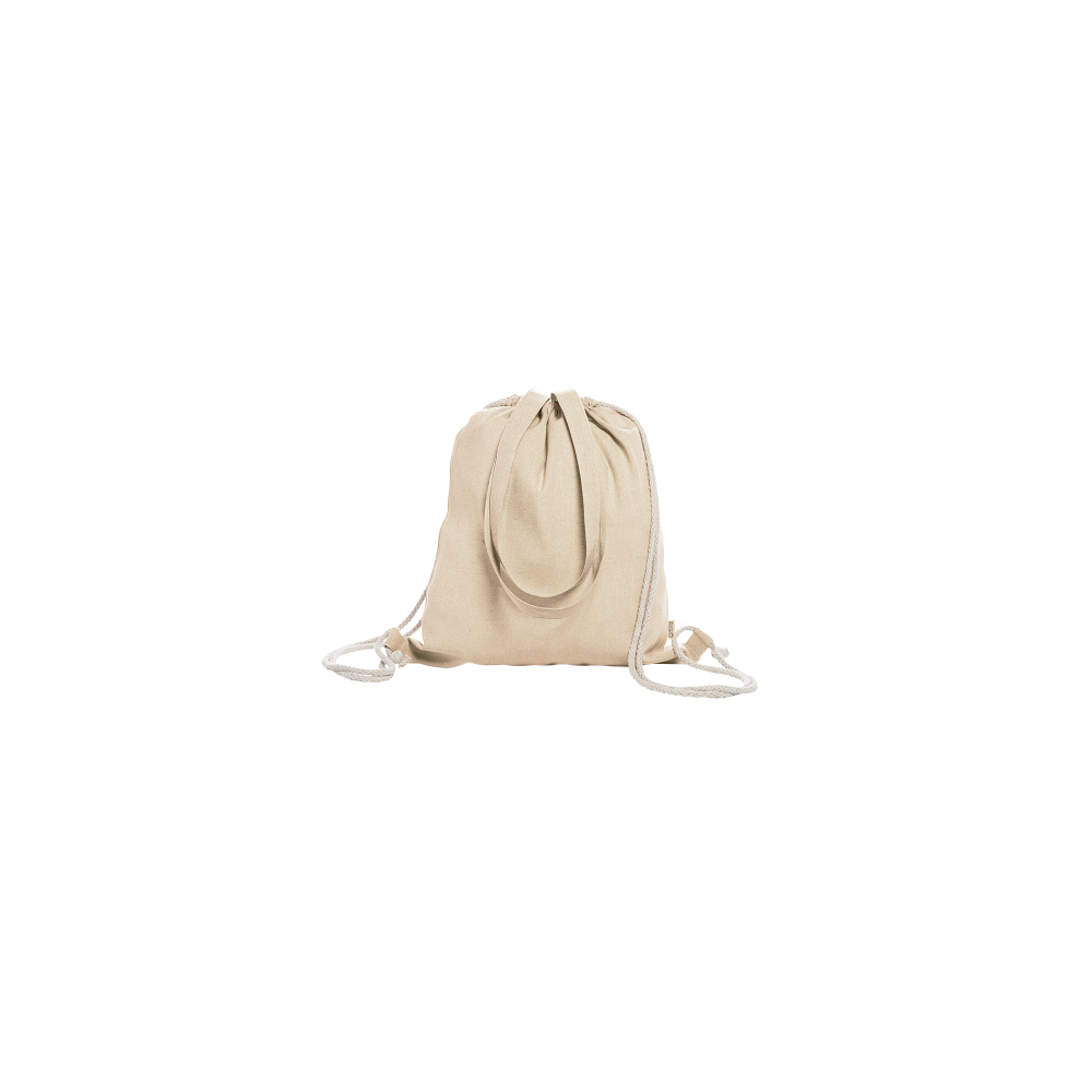Artikel-Nr: PRM250091_20Rucksacktasche mit Kordelzug aus 100 % 140 g / m² recycelter Baumwolle in meliertem Finish, mit 70 cm langen, passenden Griffen und Schnüren in Naturfarbe.