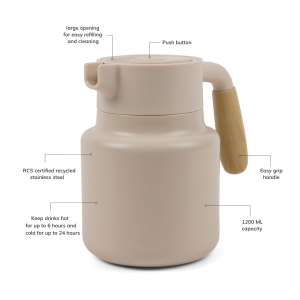 Artikel-Nr: XNDV4290013Halten Sie Ihr Getränk warm oder kalt mit dieser eleganten Isolierkanne aus RCS-zertifiziert recyceltem Stainless Steel. Sie ist sowohl funktional als auch elegant gestaltet und passt zu jedem gedeckten Tisch. Der Deckel verfügt über einen praktischen Druckknopf mit einer großen Öffnung zum einfachen Nachfüllen und Reinigen. Der Griff aus PP hat ein holzähnliches Aussehen und liegt gut in der Hand. Diese Isolierkanne kann Getränke bis zu 6 Stunden heiß und bis zu 24 Stunden kalt halten. Zertifiziert durch RCS (Recycled Claim Standard). Die RCS-Zertifizierung garantiert, dass die gesamte Lieferkette der recycelten Materialien zertifiziert ist. Der Gesamtanteil an recyceltem Material basiert auf dem Gesamtgewicht des Produkts. Dieses Produkt enthält 62% RCS-zertifiziert recyceltes Stainless Steel. Nur Handwäsche. Nicht mikrowellengeeignet. Fassungsvermögen: 1200ml.