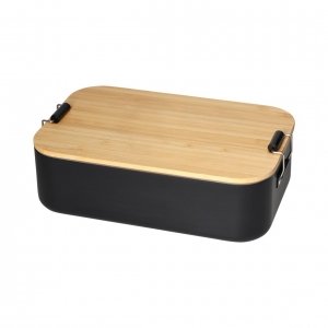 Artikel-Nr: ELT02018002-00000Große, plastikfreie Brotzeitbox für Ihre Promotion. Die Dose besteht aus Aluminium, der Deckel ist aus Bambusholz und verfügt über einen Silikonring und Klemmbügel für ein sicheres Verschließen. Der Deckel ist komplett abnehmbar und kann bei Bedarf auch als Schneidbrett verwendet werden.