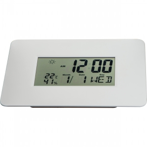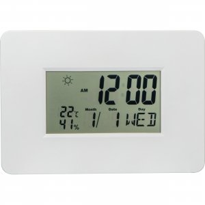 Artikel-Nr: EAG391706Digitale Wanduhr mit Kalender, Alarm und Schlummerfunktion, Thermometer und Hygrometer (automatische Aktualisierung der Werte alle 20 Sekunden) sowie einer Wetter-Anzeige. Ihre Werbung drucken wir unterhalb des Displays auf den Rand. Exklusive 2 AAA-Batterien, bestellen Sie diese gleich mit (Art. 999400).