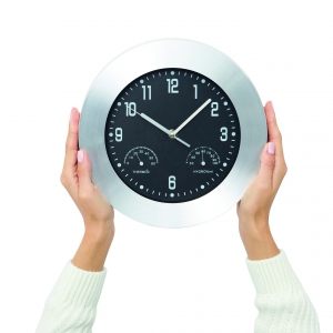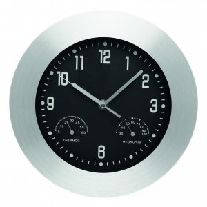 Artikel-Nr: INP56-0401220Aluminium-Wanduhr JUPITER: mit analoger Zeitanzeige, Hygro- / Thermometer und breitem Rand, batteriebetrieben (1x AA Batterie nicht enthalten)