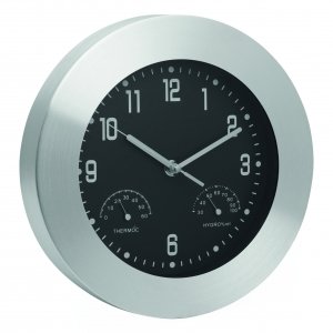 Artikel-Nr: INP56-0401220Aluminium-Wanduhr JUPITER: mit analoger Zeitanzeige, Hygro- / Thermometer und breitem Rand, batteriebetrieben (1x AA Batterie nicht enthalten)