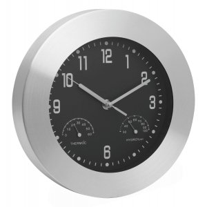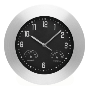 Artikel-Nr: INP56-0401220Aluminium-Wanduhr JUPITER: mit analoger Zeitanzeige, Hygro- / Thermometer und breitem Rand, batteriebetrieben (1xAA Batterie nicht enthalten)