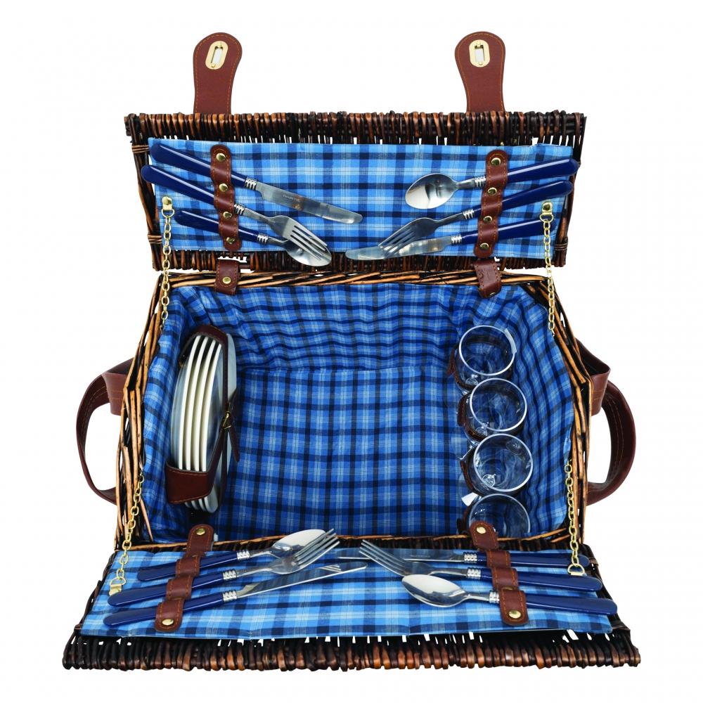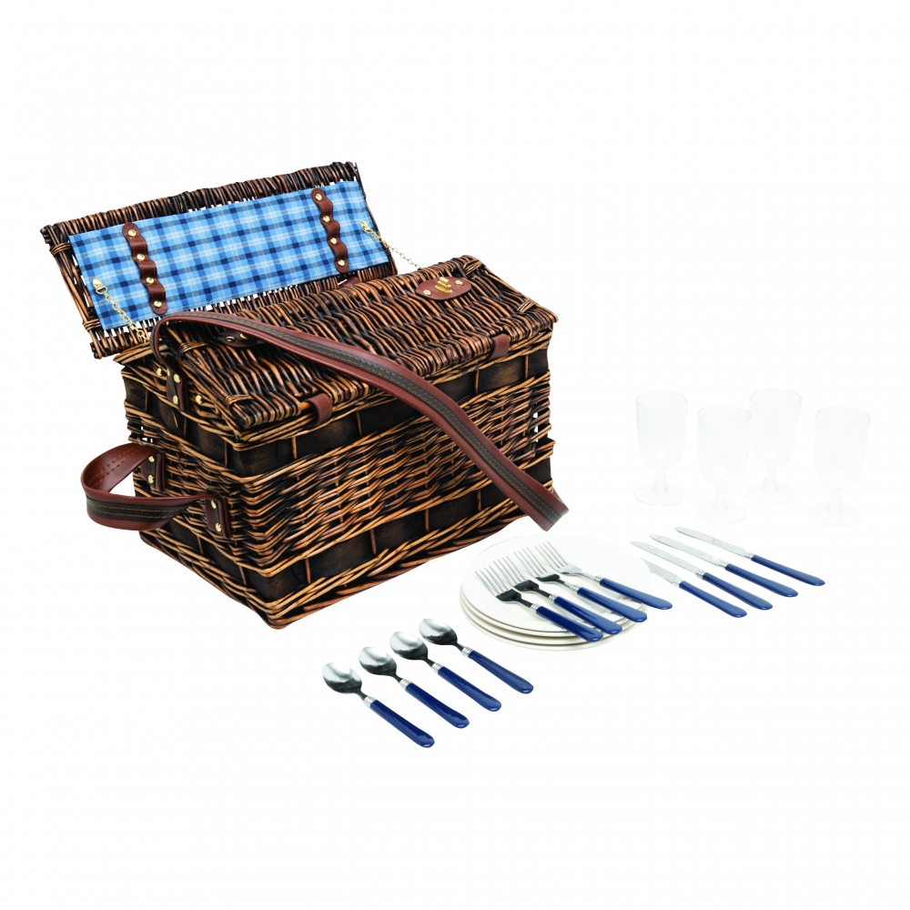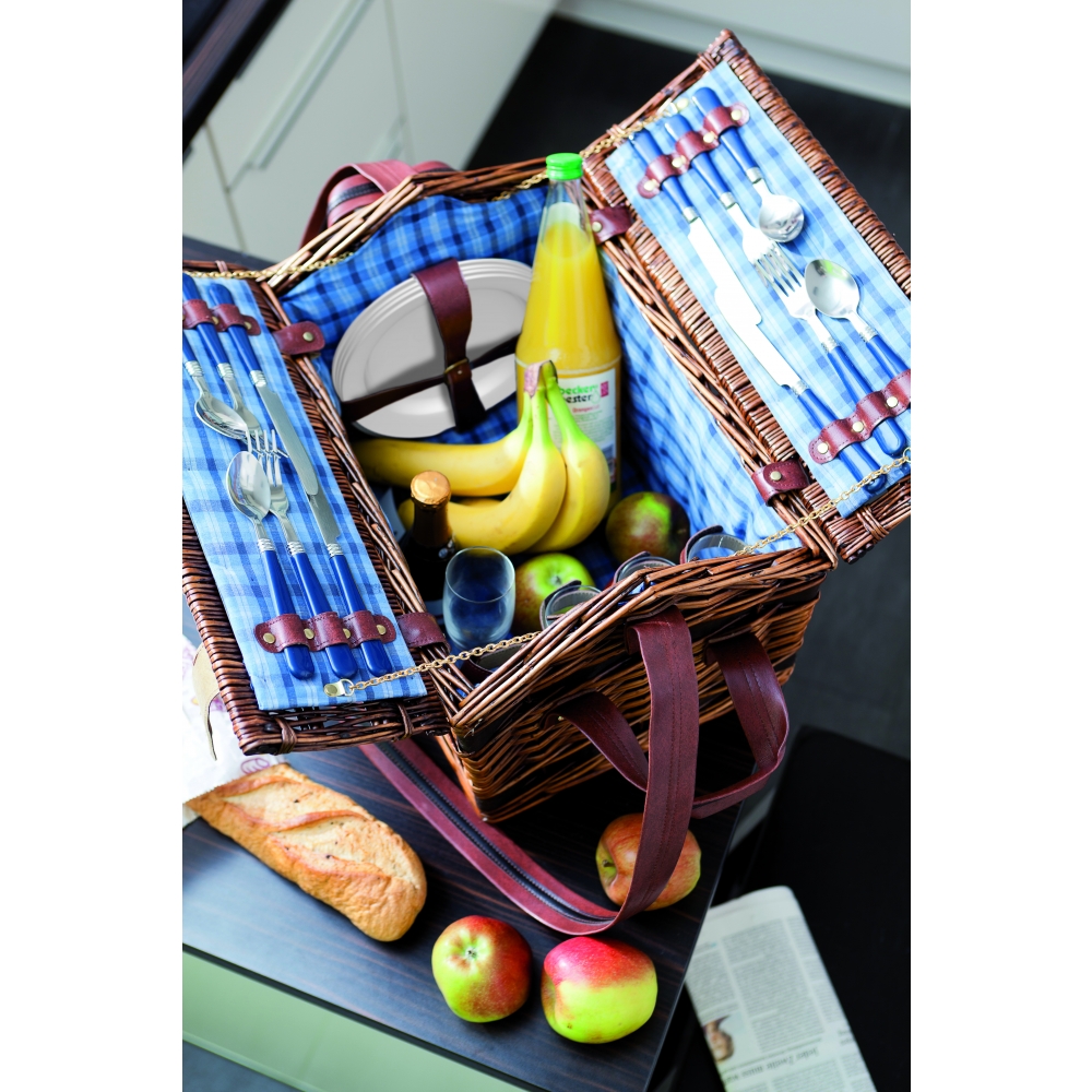 Artikel-Nr: INP56-0604032Weiden-Picknickkorb SUMMERTIME für 4 Personen: inkl. Edelstahl-Besteck mit Kunststoffgriffen, Keramikteller, Kunststoff-Weingläser, innen mit Befestigungsgurten, außen seitliche Tragegriffe, Schultergurt und Drehverschluss