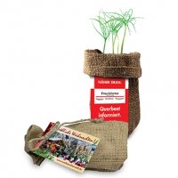 Artikel-Nr: 4012240030Im kleinen Jutesack befindet sich eine Substrattablette und Fichtensamen. Der inliegende Folienbeutel, der als Pflanzbehälter dient, wird mit Wasser befüllt und der Samen darauf eingestreut. Jetzt kann Ihr eigener Weihnachtsbaum direkt aus dem Jute-Säckchen wachsen. Die individuelle Karte ist mit einer Jutekordel befestigt. Größe: 16 x 10 cm