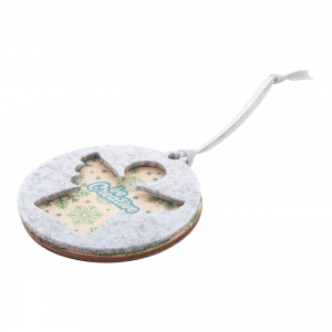 Artikel-Nr: AND716791-BIndividueller, zweilagiger Weihnachtsbaumanhänger aus RPET-Filz und Birkensperrholz mit silberner Schleife und gestanztem Weihnachtsmotiv. Der Preis ist inklusive UV-LED-Druck auf dem Holzteil. Mindestmenge: 100 Stk.