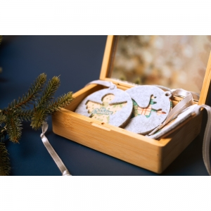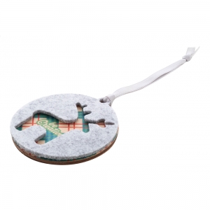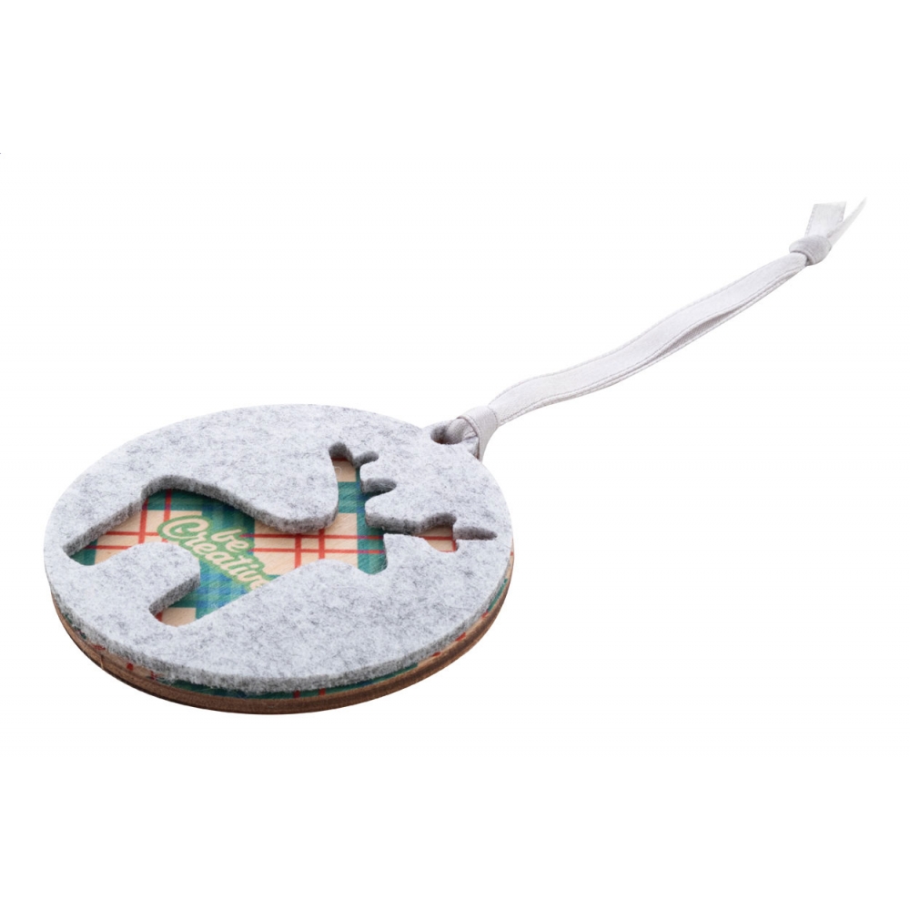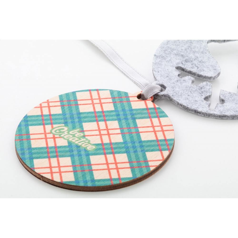 Artikel-Nr: AND716791-DIndividueller, zweilagiger Weihnachtsbaumanhänger aus RPET-Filz und Birkensperrholz mit silberner Schleife und gestanztem Weihnachtsmotiv. Der Preis ist inklusive UV-LED-Druck auf dem Holzteil. Mindestmenge: 100 Stk.