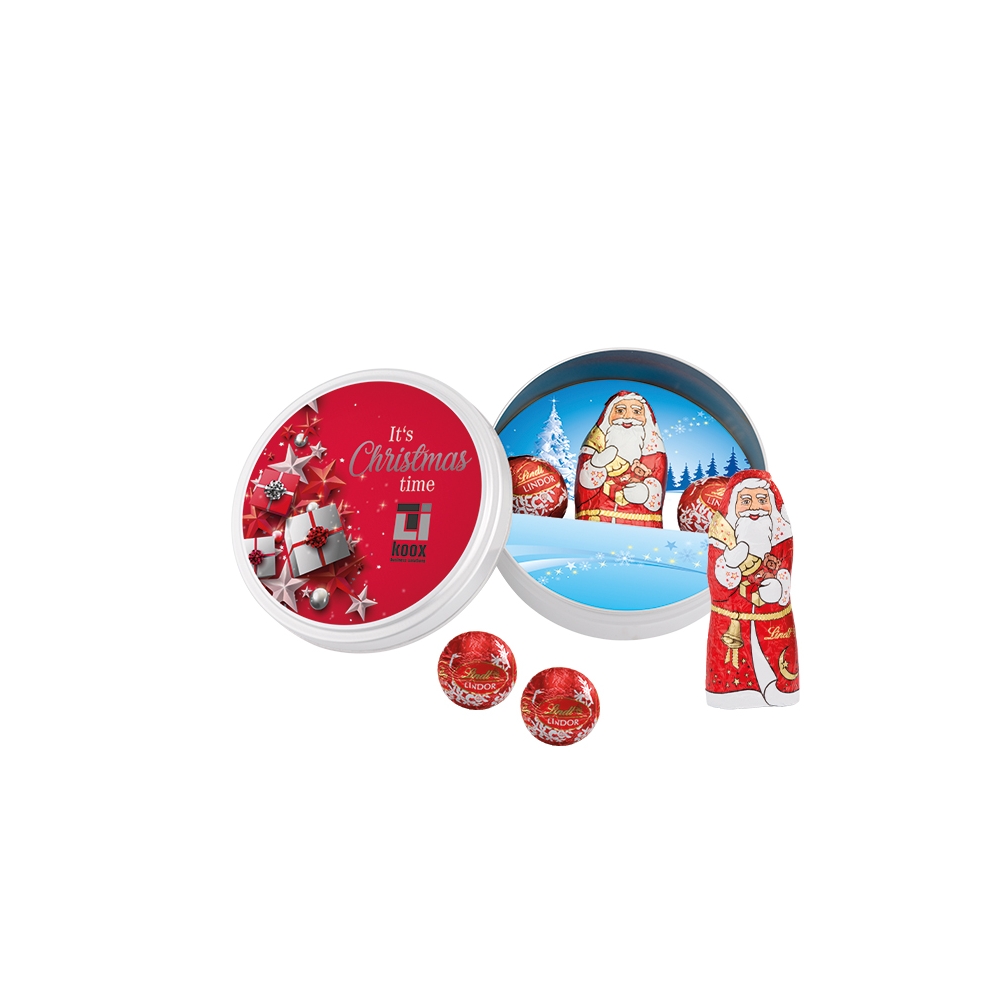 Artikel-Nr: PUC1101.00001Runde weiße Dose mit Stülpdeckel, Weißblech 98 % , Deckel ndividuell bedruckt. Mit weihnachtlich gestaltetem Einleger. Inhalt: 1 Lindt Schoko Weihnachtsmann aus feiner Alpenvollmilchschokolade, 10 g und 2 LINDOR Mini Milchkugeln à 4,5 g, gesamt 19 g. Saisonartikel - solange der Vorrat reicht!