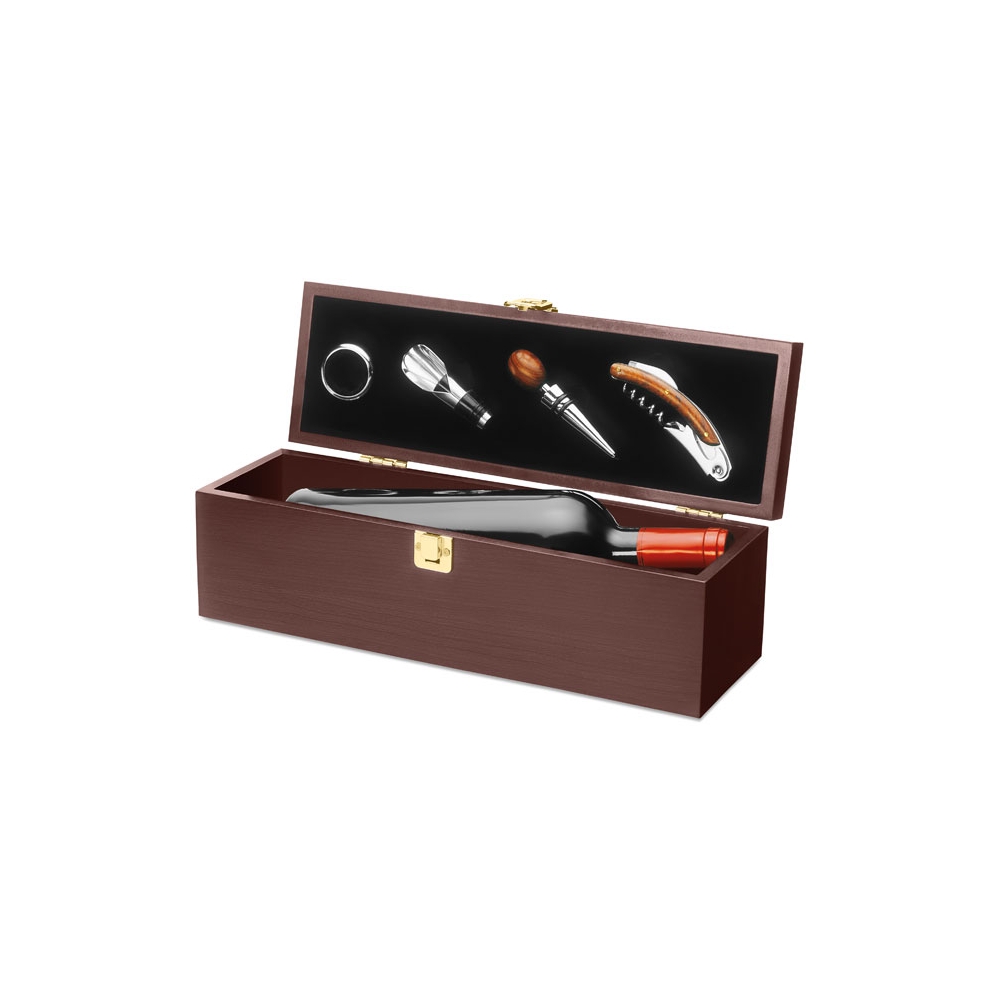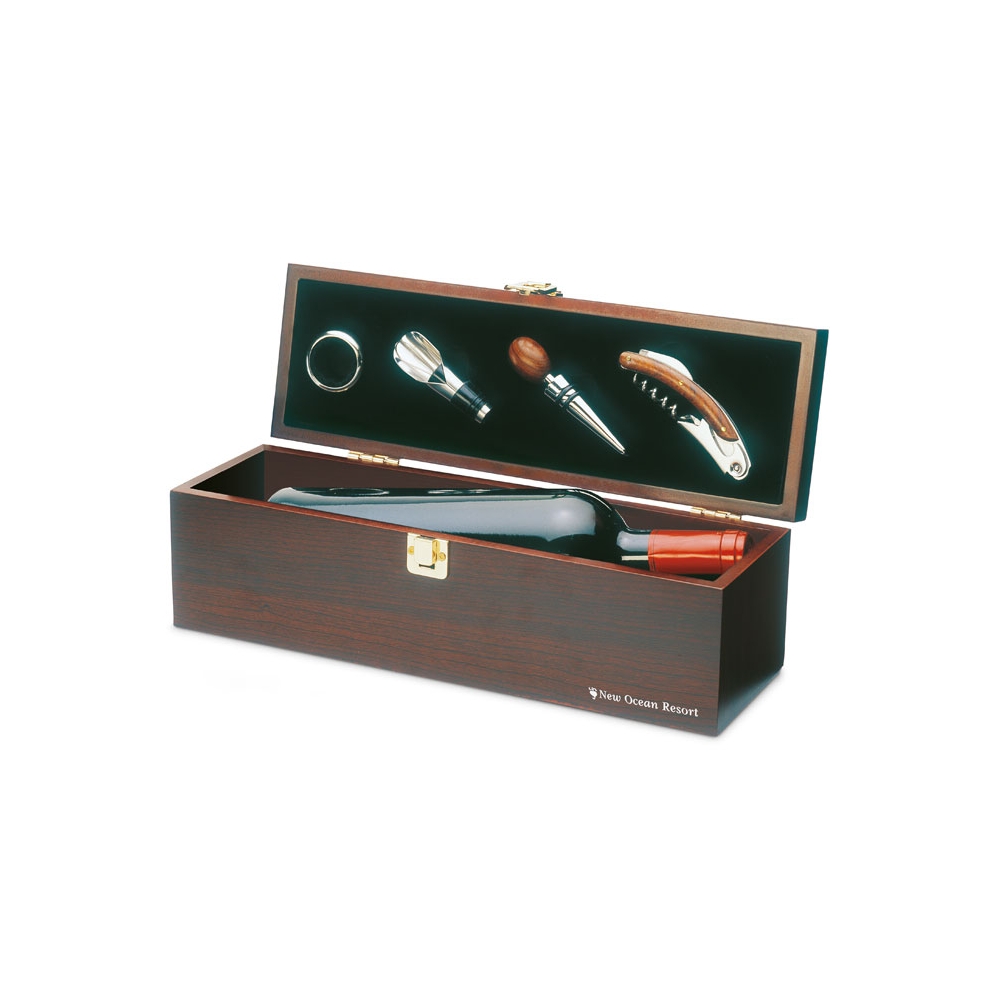 Artikel-Nr: OCBKC2690-40Geschenkset mit Holzbox und 4 Weinaccessoires: Kellnermesser, Flaschenverschluss, Weinkragen und Ausgießer. Exklusive Wein.