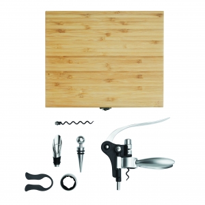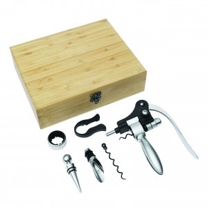 Artikel-Nr: INP56-0301151Weinset NOBLE WINE, Sommelierset in Bambus-Box, 7-teilig: mit Hebelkorkenzieher, Karbonstahl-Ersatzspindel, Edelstahl-Tropfring, Metall-Flaschenverschluss, Metall-Ausgießer und Folienschneider, in Box
