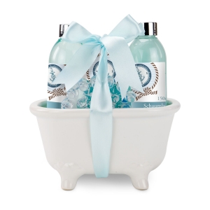 Artikel-Nr: ROP4WS149-18Eine Wanne voller Entspannung bietet dieses Set. 150 ml Duschgel, 150 ml Schaumbad, 200 g Badesalz sowie eine Massagebürste aus Kunststoff sind stilvoll verpackt in einer weißen Keramik-Badewanne. Duft Ocean.