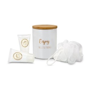 Artikel-Nr: ROP4WS193-13Sind Sie ein Genießer? Dann probieren Sie unser Wellness-Geschenkset Enjoy! Verwöhnen Sie sich mit einem weißen Mesh-Schwamm und je 50 ml Duschgel und Bodylotion in der wohltuenden Duftrichtung Honig und Milch und lassen Sie Ihre Seele baumeln. Die pflegende Kombination kommt verpackt in einem eleganten, weißen Keramiktopf mit goldenem Aufdruck "Enjoy the little things". Dieser eignet sich ideal als dekoratives Accessoire für Ihr Badezimmer und bleibt somit lange erhalten.
