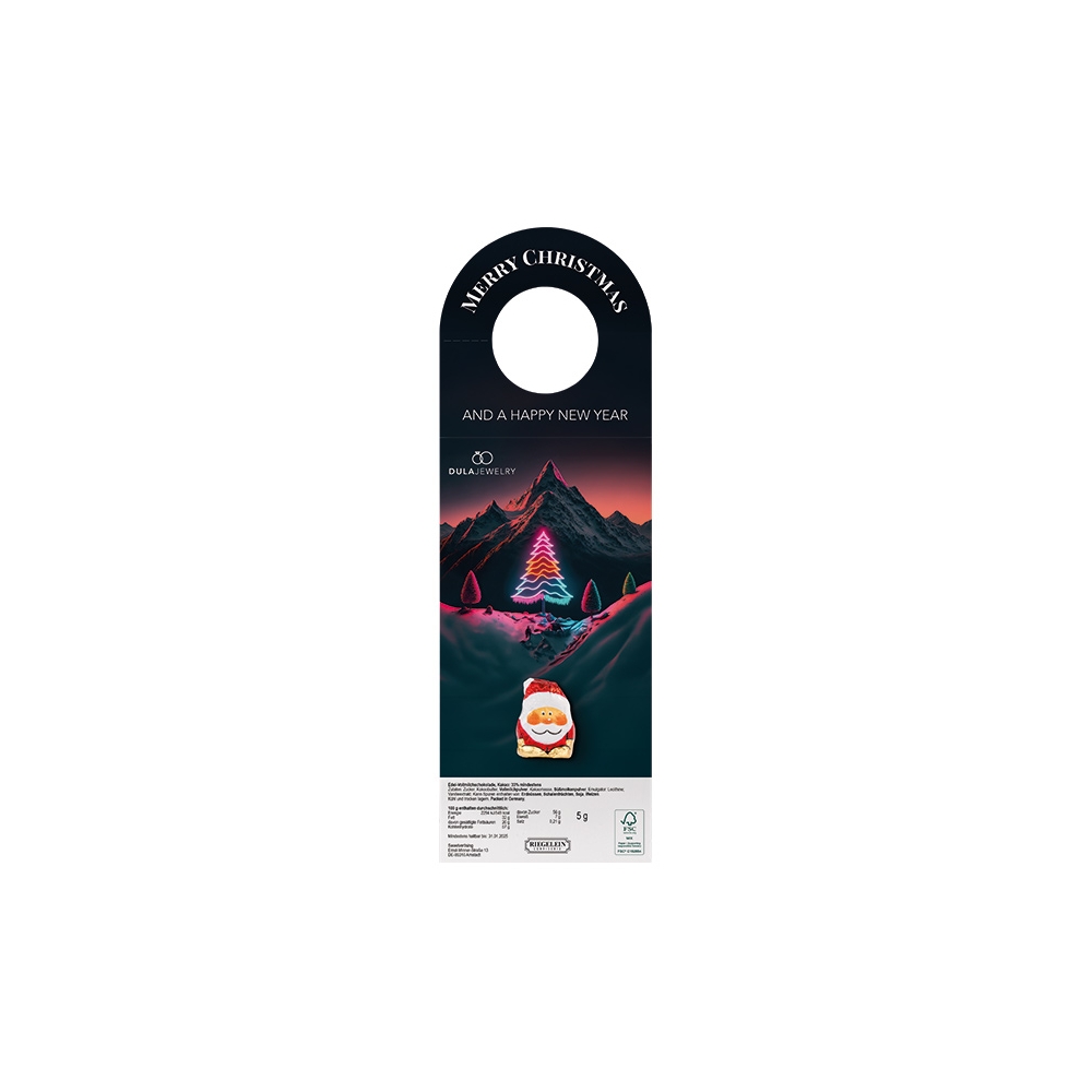 Artikel-Nr: PUC1251.00014Werbeanhänger komplett aus weißem Karton, individuell bedruckt. Inhalt: 1 kleiner Riegelein Schoko-Weihnachtsmann, Edelvollmilchschokolade, 5 g. Saisonartikel - solange der Vorrat reicht!
