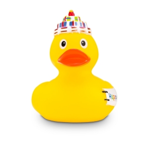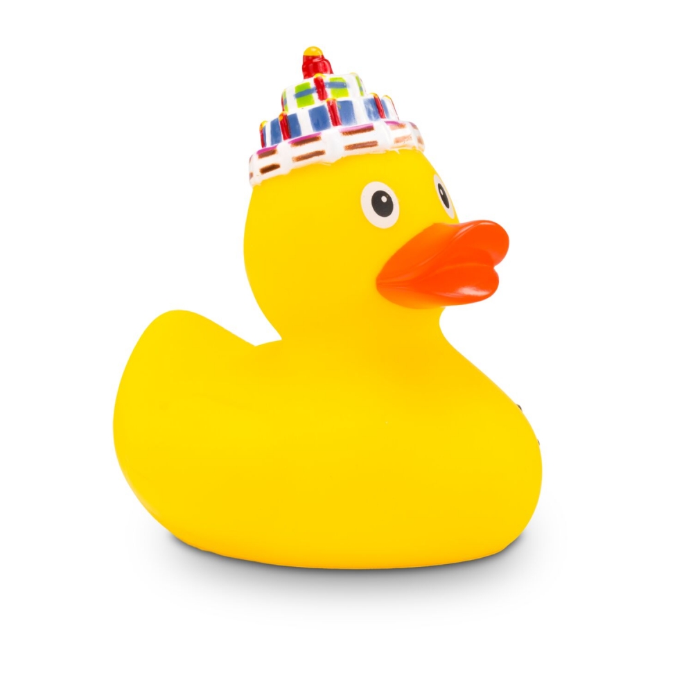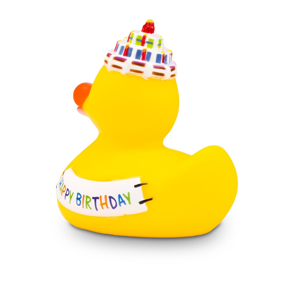 Artikel-Nr: ROP4BE3016-1Die fröhliche Quietscheente Gabi Geburtstag ist eine originelle Geburtstagsüberraschung. Sie trägt eine Geburtstagskuchenmütze mit Kerze auf dem Kopf und hat ein ‚Happy Birthday‘-Banner an der Seite. So sorgt diese Badeente garantiert für gute Laune bei jeder Feier. Perfekt als witziges Giveaway für jedes Alter, bringt diese Badeente Spaß, Farbe und ein Lächeln mit sich. Größe: ca. 8 cm. Inklusive Quietschventil