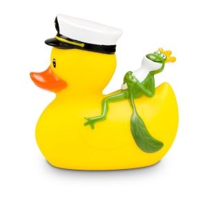 Artikel-Nr: ROP4BE3074-1Die maritime Quietscheente mit besonderem Reise-Begleiter. Karl Kapitän trägt stolz seine Kapitänsmütze mit Goldankersymbol, während sich der kleine grüne Froschkönig entspannt auf seinem Rücken ausruht. Diese detailreiche Badeente ist das perfekte Geschenk für Seefahrer, Märchenfans, oder als origineller Werbeartikel für Kreuzfahrten und maritime Events. Größe: ca. 8 cm. Inklusive Quietschventil