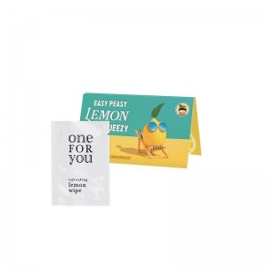 Artikel-Nr: PUC1233.00007Große Werbekarte aus weißem Karton, mit Abreißperforation. Inhalt: 1 Tütchen mit einem Erfrischungstuch mit zartem Zitronenduft, 7 g
