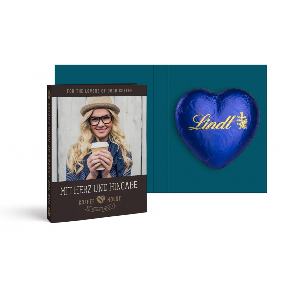 Artikel-Nr: MGN07006-0004Individuell beidseitig bedruckbare Werbeklappkarte mit einem innen liegenden Lindt Herz aus feiner Vollmilchschokolade, wahlweise in Rot, Blau, Gold oder Grün. Die hochwertige Kartonage bietet ausreichend Platz für Ihre persönliche Werbebotschaft und macht dieses süße Give-away zu einem charmanten Präsent, das Emotionen weckt und nachhaltig in Erinnerung bleibt.