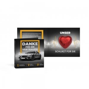 Artikel-Nr: MGN07007-0001Werbeklappkarte individuell beidseitig bedruckt mit innenliegendem Lindt Herz aus Vollmilchschokolade (rot oder gold).