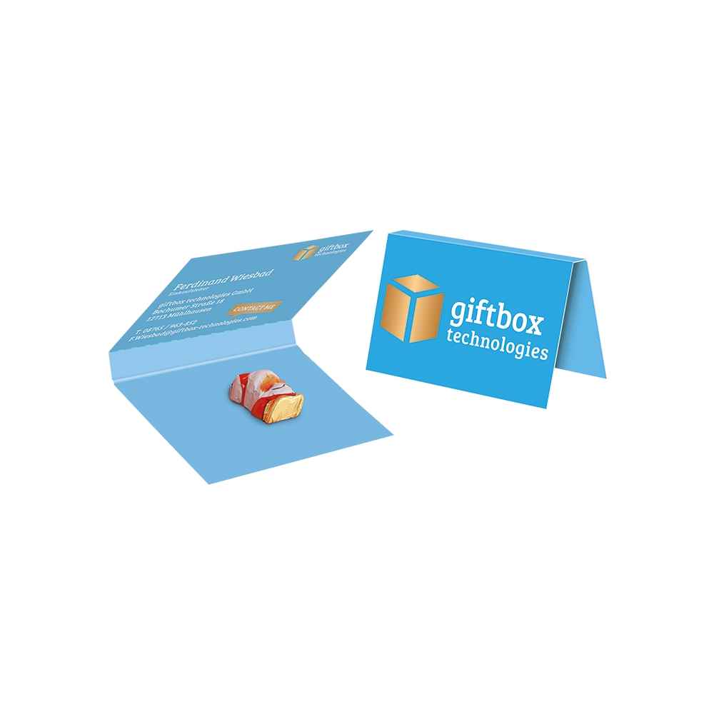 Artikel-Nr: PUC1145.00005Aufklappbare Werbekarte im Visitenkartenformat, weißer Karton, mit praktischer Abreißperforation, individuell bedruckt. Inhalt: 1 Confiserie Riegelein Schokoladen Weihnachtsmann aus Edelvollmilchschokolade, 5 g. Saisonartikel - solange der Vorrat reicht!