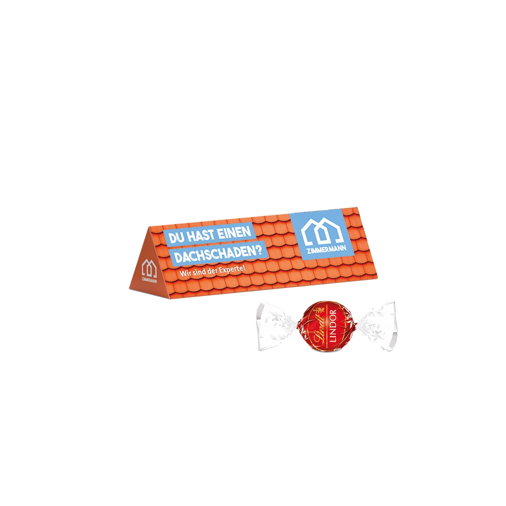 Artikel-Nr: PUC1250.00001Werbeschuber in Prismaform aus weißem Karton, individuell bedruckt. Inhalt: 4 LINDOR Milch Kugeln von Lindt aus feiner Vollmilchschokolade, 12,5 g