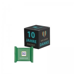 Artikel-Nr: PUC1279.00002Würfelförmige Werbeverpackung aus weißem Karton, individuell bedruckt. Inhalt: 4 Ritter SPORT mini Schokolade, Haselnuss (nur sortenrein), 66 g