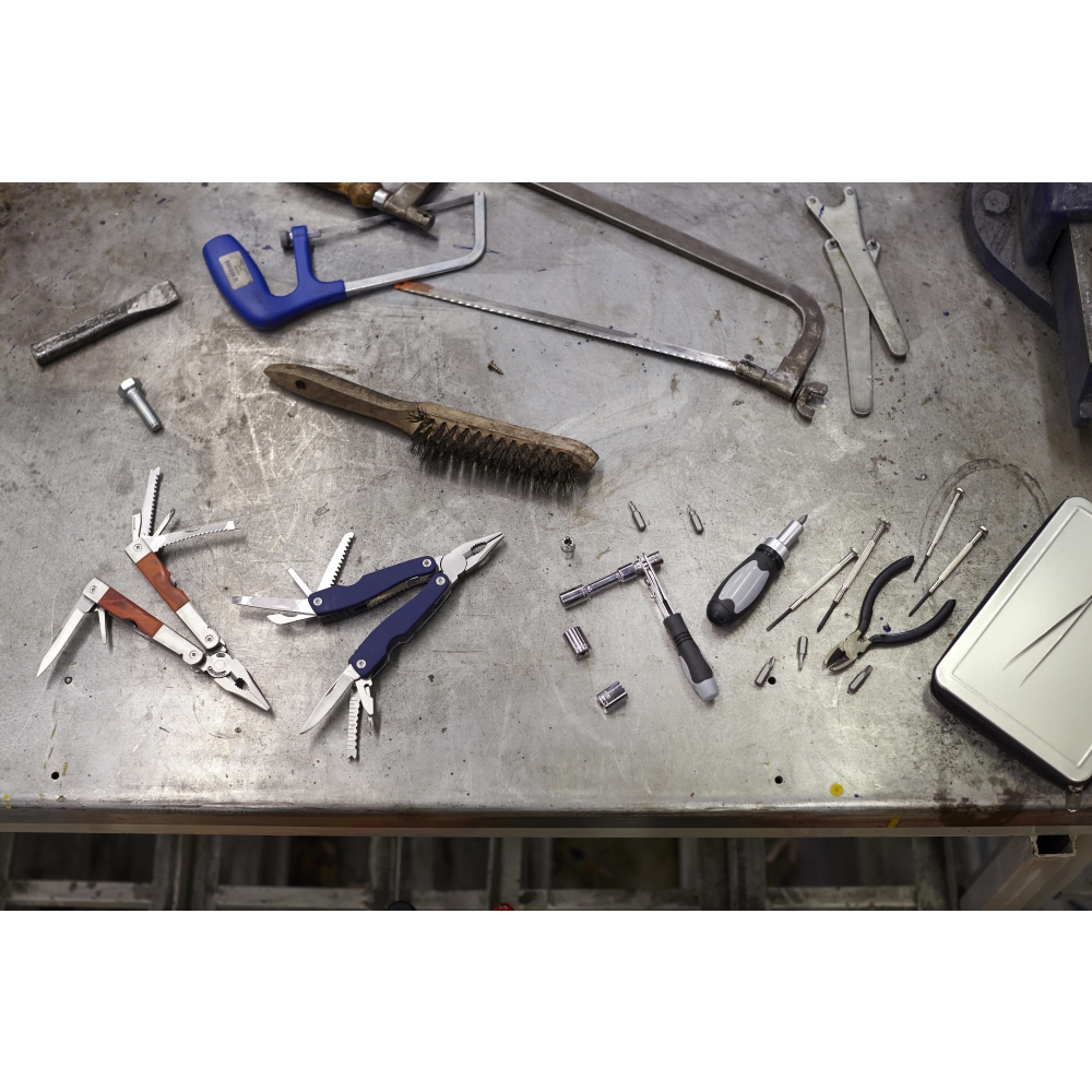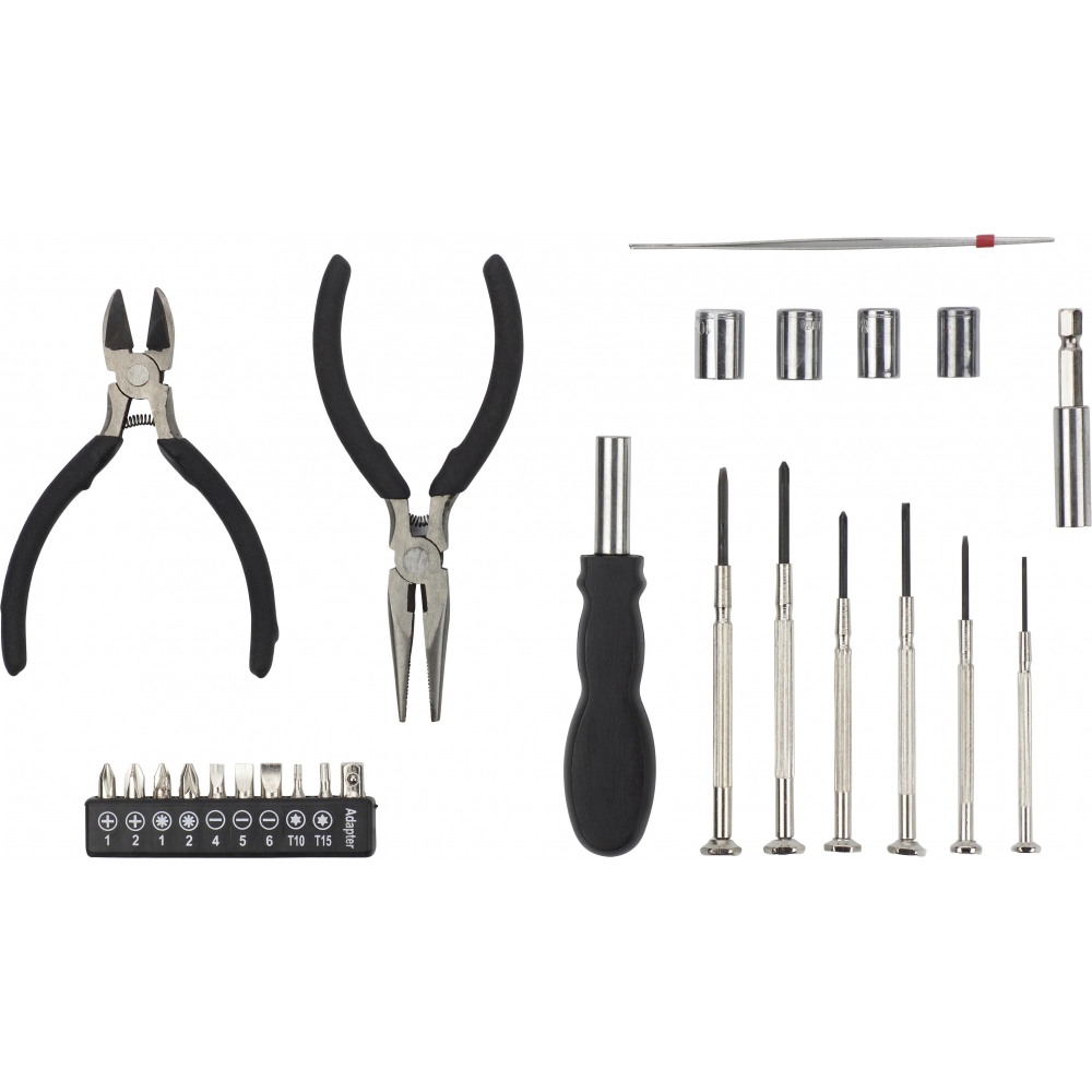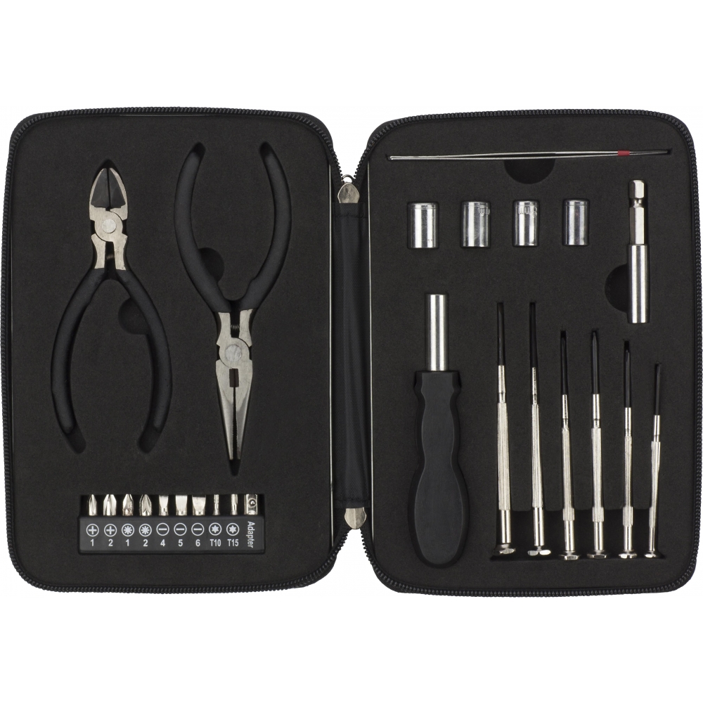 Artikel-Nr: GIV3614032Werkzeug-Set bestehend aus Seitenschneider, Flachzange, Bit-Set (10-tlg.), Pinzette, Schraubendreher, 4 Metall-Nüssen, 6 Feinmechaniker-Schraubendrehern, inklusive Metallbox.