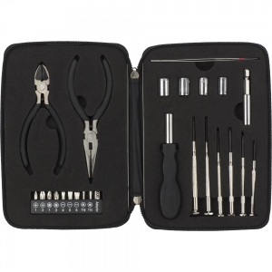 Artikel-Nr: GIV3614032Werkzeug-Set bestehend aus Seitenschneider, Flachzange, Bit-Set (10-tlg.), Pinzette, Schraubendreher, 4 Metall-Nüssen, 6 Feinmechaniker-Schraubendrehern, inklusive Metallbox.