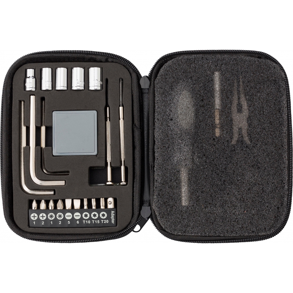 Artikel-Nr: GIV433300001Lederkoffer mit Werkzeugsatz, schließt mit Reißverschluss. Das Set enthält: 5 Steckschlüssel, 3 Sechskantschraubendreher, 9 Schraubenbits, 1 Maßband, 1 Bit-Adapter, 2 Präzisions-Schraubendreher, 1 Schraubendrehergriff, 1 Verlängerungsstange, 1 Spitzzange.
