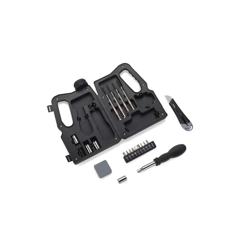 Artikel-Nr: ARD29187-02KANNIS ist ein Set mit vielen nützlichen Werkzeugen: vier Präzisionsschraubendreher, ein Tapetenschneider, ein Maßband, ein Halter, vier Steckschlüssel mit Adapter und neun Bits. Alles ist in einem charakteristischen kanisterförmigen Gehäuse verschlossen.
