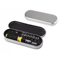 Metallwerkzeug mit Kunststoff und Gummiteile in Geschenkbox aus Metall, 14 Funktionen.