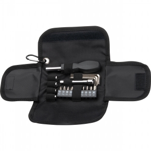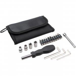 Artikel-Nr: EAG084903Werkzeugset bestehend aus einem Schraubendreher mit diversen Nüssen und Bits, einem Verlängerungsstück sowie drei Sechskantschlüsseln in verschiedenen Größen, verpackt in einem Etui mit Karabinerhaken. Ihre Werbung drucken wir mittig auf das Etui.
