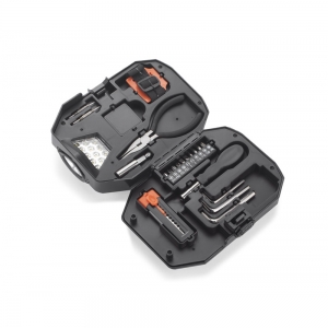 Artikel-Nr: ARD29138Multifunktionswerkzeug-Set ETI verbirgt seine Funktionalität im Inneren einer Taschenlampe. In dem Innern der Taschenlampe befinden sich die nützlichsten Werkzeuge wie: Schraubenzieher mit einem Satz von austauschbaren Bits, 3 Inbusschlüssel, ausziehbare Klinge, zwei Präzisionsschraubendreher, Maßband und Zangen. Das interessanteste Element des Satzes ist eine Leuchte mit zwei Lichtarten, die man als ein stationäres Licht verwendet kann, indem man einen faltbaren Arm auszieht. Zusätzlich kann die Lampe von der Basis lösen und auf dem Set in der Bar enthalten ist fixiert, wodurch ein komfortable Scheinwerfer zu erhalten.