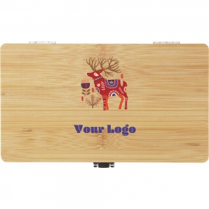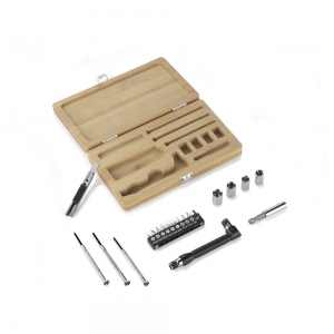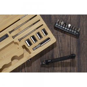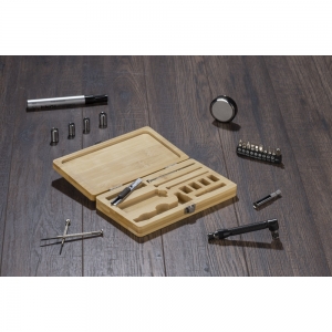 Artikel-Nr: ARD29179-17MAD ist ein Werkzeugset in einem Bambuskoffer. Das Set enthält: einen Schraubendreher, zehn verschiedene Bits, eine Verlängerung, vier Steckschlüssel (7 mm, 8 mm, 9 mm und 10 mm), drei Präzisionsschraubendreher und einen Tapetenschneider. Das Etui abschließbar mit Druckknopfverschluss.