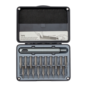 Artikel-Nr: RFS52629-BKPräzise Arbeit erfordert präzise Werkzeuge. Dieses hochwertige Werkzeug-Set für Feinmechanik präsentiert sich in einer stilvollen, schwarzen Box und wurde speziell für filigrane Arbeiten an Laptops, Computern, Brillen und ähnliches konzipiert. Der matte Schraubendreher mit Bithalter und die 19 magnetischen Bits aus besonders hartem S2-Edelstahl - darunter 9 Sternschrauben Bits, 2 Schlitzschrauben Bits und 8 Kreuzschrauben-Bits - sorgen für maximale Anpassungsfähigkeit und Präzision. Die Box aus recyceltem ABS-Kunststoff zeigt sich nicht nur elegant, sondern bewahrt mit ihrem hochwertigen Magnetverschluss den Inhalt sicher auf. Das Innere aus recyceltem Polypropylen schützt und organisiert die Werkzeuge optimal. Die Box kann mit UV- oder Tampondruck veredelt werden. Auf Anfrage bieten wir auch eine Lasergravur auf dem Bit-Halter aus Edelstahl an.