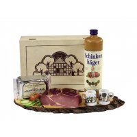 Artikel-Nr: 7980030In dekorativer Holztruhe, vielseitig verwendbar, 1 Flasche, 0,7 l, Schinkenhäger, 38 % vol., im Tonkrug, 1 Stück Gourmet-Bauernschinken, ca. 500 g, 1 Paket westf. Delikatess-Pumpernickel, 500 g, -ohne Stamper- Versandfertig und bruchsicher im Umkarton verpackt.