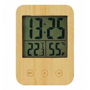 Artikel-Nr: INP56-0401003Wetterstation MIX: mit Bambusfront, Alarmfunktion, Zeitanzeige, Hygrometer und Thermometer (°C und °F), ausklappbarer Aufsteller und Loch zur Wandmontage auf der Rückseite, batteriebetrieben (2x AAA Batterien nicht enthalten), in Box