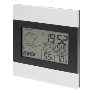 Artikel-Nr: INP56-0401032Wetterstation SHINY DAY: mit LCD-Anzeige, Aluminiumfront, Alarmfunktion, Datumsanzeige, Thermometer, ausklappbarer Aufsteller auf der Rückseite, batteriebetrieben (2xAAA Batterie nicht enthalten)