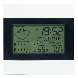 Artikel-Nr: INP56-0401032Wetterstation SHINY DAY: mit LCD-Anzeige, Aluminiumfront, Alarmfunktion, Datumsanzeige, Thermometer, ausklappbarer Aufsteller auf der Rückseite, batteriebetrieben (2x AAA Batterie nicht enthalten)