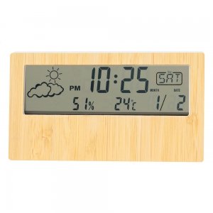 Artikel-Nr: AND733974Digitale Uhr / Wetterstation aus Bambus und ABS-Kunststoff mit Thermometer- und Luftfeuchtigkeit-Anzeige. Exkl. Batterien (2xAAA).