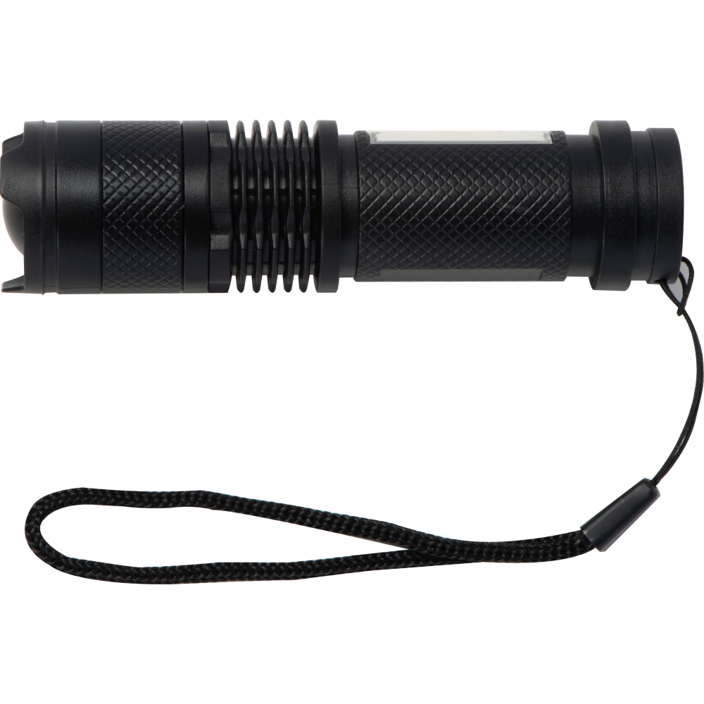 Artikel-Nr: EAG385203Wiederaufladbare (400 mAh) COB-Taschenlampe aus Kunststoff mit zwei verschiedenen Leuchtmodi (normal und blinkend) sowie einem einstellbaren Fokus und einer weiteren Lampe am Griff. Inkl. Ladekabel (USB- auf USB-C-Anschluss). Ihre Werbung drucken wir auf die glatte Fläche am Schaft.