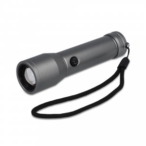 Artikel-Nr: ART93321N0005Wiederaufladbare Taschenlampe mit einem 1200-mAh-Akku und 5-W-LED-Licht mit 200 lm Helligkeit. Verfügt über eine Handschlaufe, mehrere Lichtmodi (hoch, niedrig und Blitz) und eine Zoomfunktion. Hergestellt aus recyceltem Aluminium und wasserdicht nach IPX4.