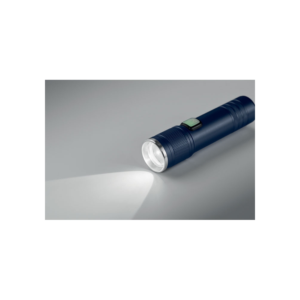 Artikel-Nr: OCBMO2724-85Wiederaufladbare, ausziehbare COB-Taschenlampe mit 110 Lumen, 3 Lichtmodi und Zoomfunktion. Recyceltes Aluminium. Handschlaufe. Inkl. 400mAh-Akku und Ladekabel.