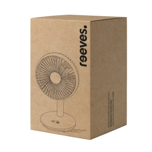 Artikel-Nr: RFS52630-WEHeiße Sommertage sind eine Herausforderung für den Körper. Erleichterung verschafft unser handlicher Tischventilator REEVES-DESKSTREAM mit einem kühlenden Luftstrom. Der weiße Tischventilator aus Kunststoff verfügt über 3 Intensitätsstufen und eine Intervallschaltung. Der Ventilatorkopf lässt sich stufenlos vertikal ausrichten. Der Ventilator ist besonders flexibel und angenehm in der Handhabung, da er nicht permanent an einer Stromquelle angeschlossen sein muss. Der 22 cm hohe Tischventilator ist über einen USB-C-Anschluss wiederaufladbar. Ein passendes USB-Typ-C auf USB-Typ-A-Kabel ist im Lieferumfang enthalten. Die Laufzeit bei kleinster Intensitätsstufe beträgt ca. 4 Stunden. Der runde Standfuß ist mit gummierten Antirutschfüßen versehen und sorgt für einen kippfesten Stand. Darüber hinaus ist im robusten Standfuß noch eine in zwei Stufen dimmbare LED-Beleuchtung integriert. Die Funktionstasten für den Ventilatorbetrieb und das Licht sind auf dem Fuß des Gerätes gut sichtbar angebracht. Außerdem verfügt das Gerät über eine beleuchtete Ladestandsanzeige (blau) und dient ebenso als Kontrollleuchte, wenn das Gerät aufgeladen wird (rot).Die siebenblättrigen Ventilatorflügel sind von einem Schutzgitter umgeben. Die glatte, münzgroße Fläche auf dem Ventilationsblätterschutz ist die perfekte Werbefläche. Die Werbeanbringung kann im Tampon- oder UV-Druck erfolgen. Überspannungs-, Überhitzungs- und Kurzschlussschutz sind im Gerät integriert.