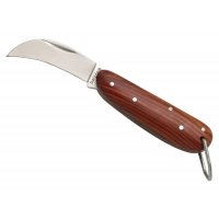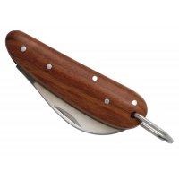 Klappmesser mit geschwungener Klinge aus 420er Edelstahl. Griff aus dunklem Massivholz. Öse zur Befestigung an Trageband oder Kette. Nutzbare Klingenlänge: 5 cm.