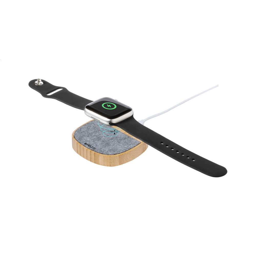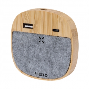 Artikel-Nr: AND733395-80Wireless-Fastcharger (15 W) im Gehäuse aus Bambus und RPET-Filz. Mit 1 USB- und 1 USB-C-Ladeanschluss für gleichzeitiges kabelgebundenes und kabelloses Laden. Inklusive USB-Ladekabel.