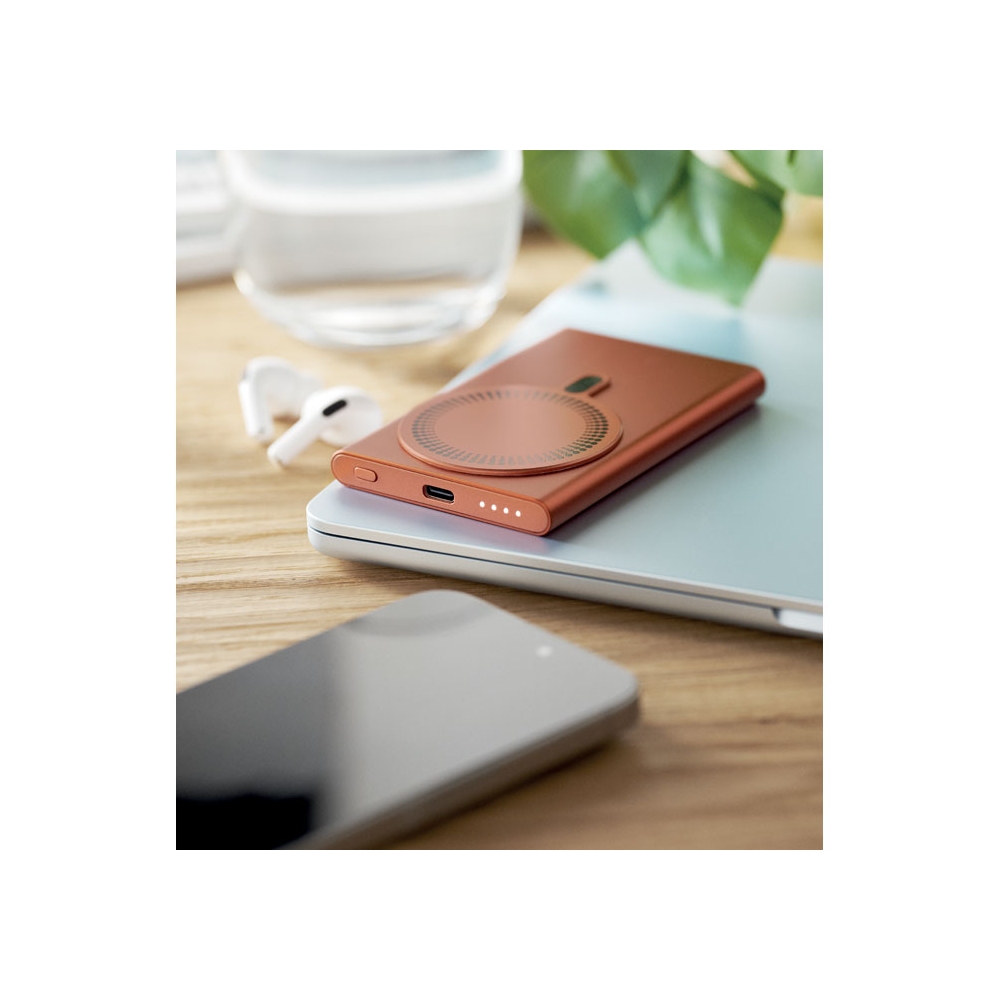 Artikel-Nr: OCBMO2442-10Magnetische kabellose Ladestation (15 W) aus recyceltem Aluminium und Powerbank (5000 mAh). Ausgang: DC 9V/1,66A. Kabelunterstützte Schnellladetechnik (20 W). Eingang / Ausgang: Typ-C. Power Delivery (PD)-Unterstützung zum Aufladen des neuesten MacPro®-Laptops. Eingang / Ausgang: Typ-C.