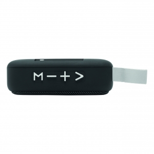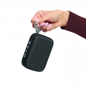 Artikel-Nr: INP56-0406202Wireless-Lautsprecher BAM: Musikleistung 3 Watt, zur Koppelung mit wireless-fähigen Geräten, kompatibel zu Bluetooth®, Reichweite ca. 10 m, microSD-Slot und USB Typ A-Anschluss für MP3-Funktion, Freisprechfunktion, leistungsstarker Lithium-Akku, Kapazität: 300 mAh, inkl. USB-Ladekabel mit Micro-USB Stecker (Länge: ca. 30 cm), mit Bedientasten oben, An- und Ausschalter auf der Rückseite, grauer Trageschlaufe und rutschhemmenden Standfüßen, in Box