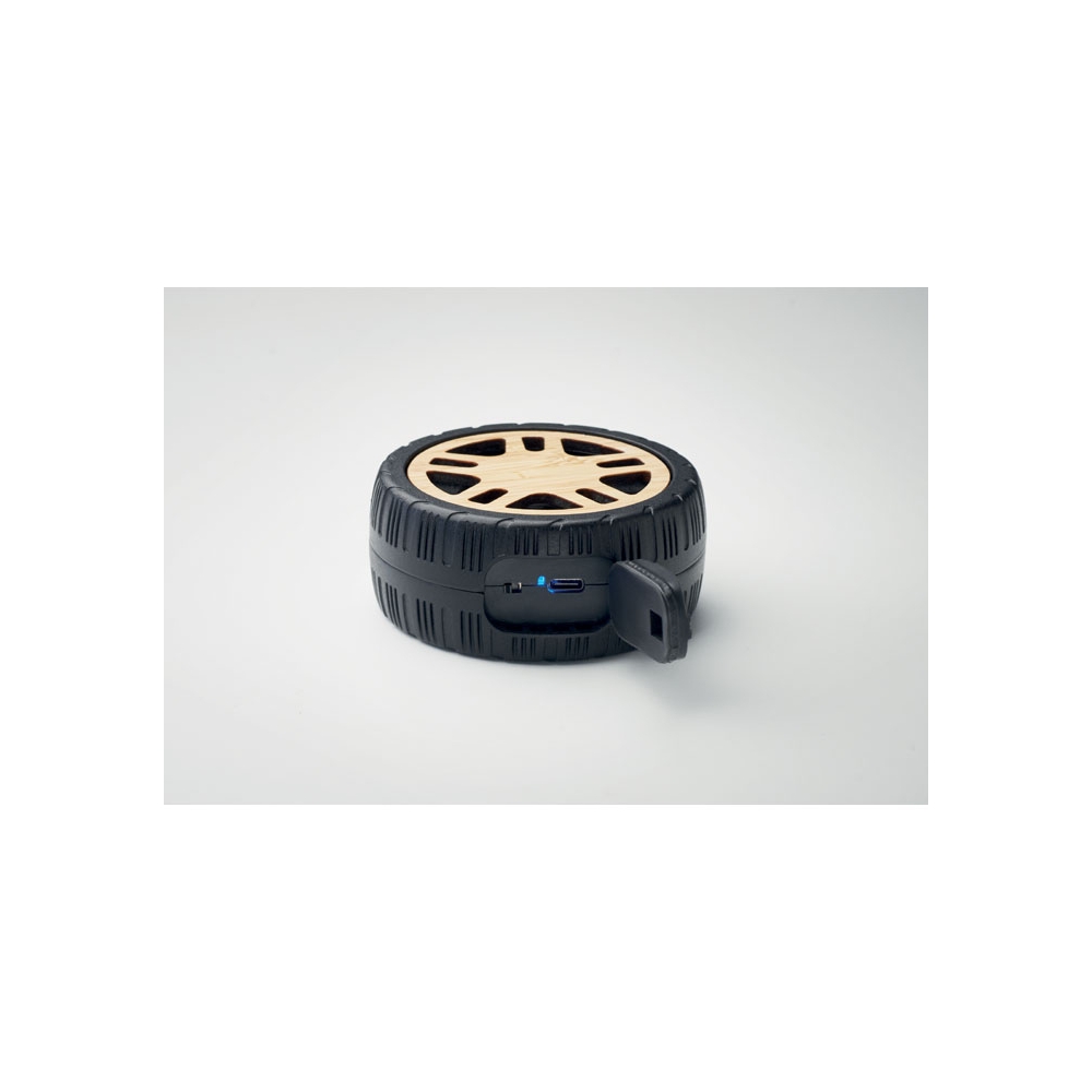 Artikel-Nr: OCBMO2210-405.3 wireless Lautsprecher (3W) in Optik eines Autoreifens. Recyceltes ABS mit Details aus Bambus. Handschlaufe aus Baumwolle. Inkl. 1 wiederaufladbare 400-mAh-Batterie.