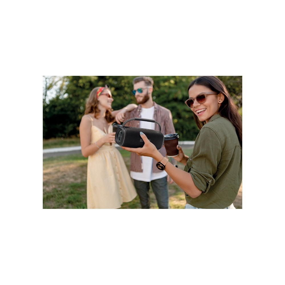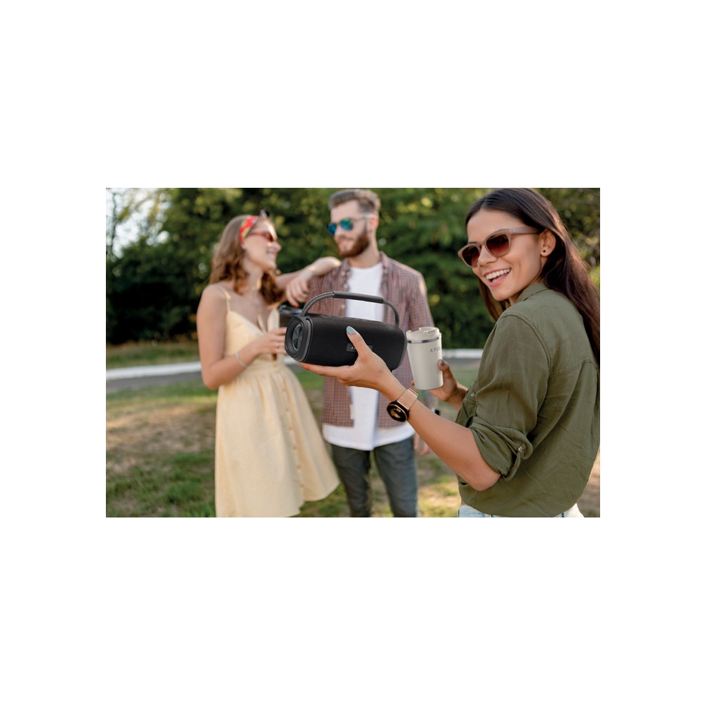 Artikel-Nr: OCBMO2172-03Wireless Lautsprecher (2 x 10W). Wechselndes farbiges LED-Licht an den Seiten. Inkl. wiederaufladbarem 2400 mAh-Akku. Inkl. AUX-, USB- und TF-Anschlüssen. Spielzeit ca. 5 h.